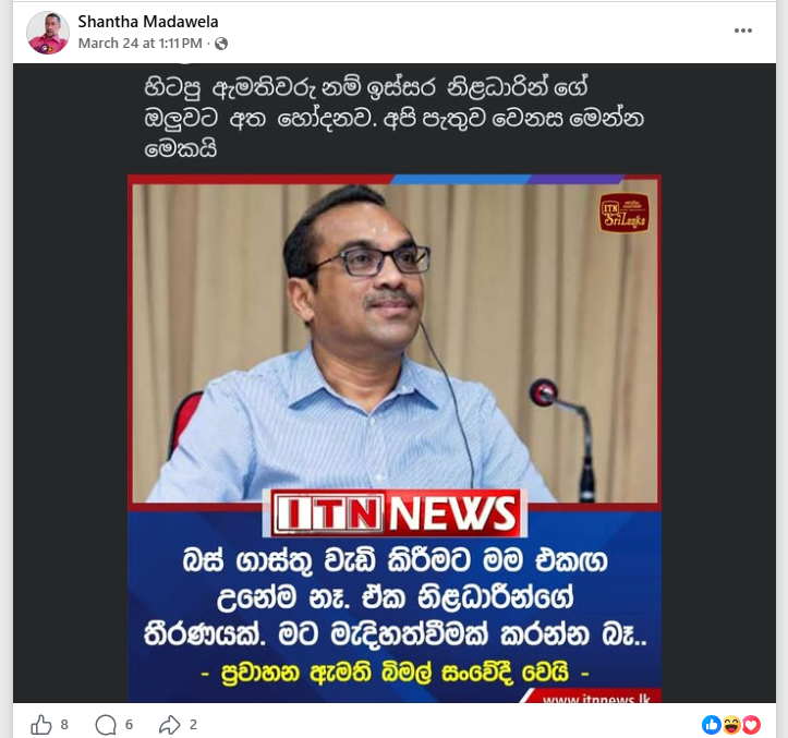 කැබිනට් මණ්ඩල අනුමැතිය යටතේ නව බස් ගස්තු ඉහළ දැමීම සිදුකර තිබීම තුළ ම සමාජ මාධ්ය සටහනේ දැක්වෙන බස් ගාස්තු වැඩි කිරීමට තමා එකඟ නොවූ බවට සහ තමාට මැදිහත්වීමක් සිදු කළ නොහැකි බවට වන සඳහන පදනම් විරහිත බව තහවුරු වේ.