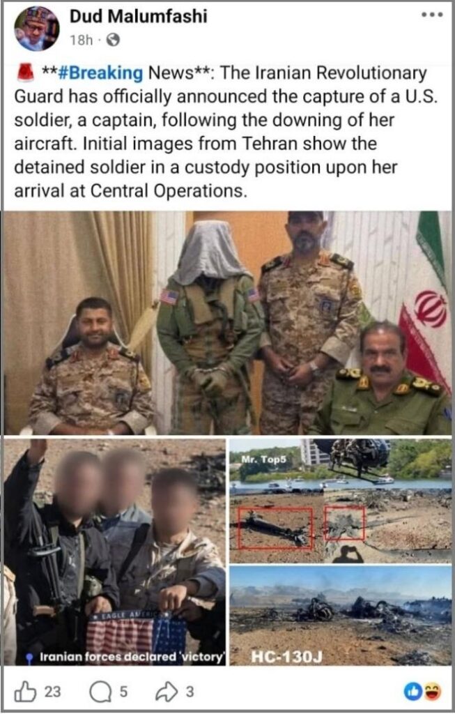 Conclusion (අවසාන නිගමනය) :අපගේ කරුණු විමර්ශනයෙන් පෙන්වා දෙන්නේ, ඉරාන විප්ලවවාදී ආරක්ෂක බලකාය විසින් ඉරාන ගුවන් සීමාවේදී අමෙරිකානු ගුවන් යානයක් වෙඩි තබා බිම හෙළීමෙන් පසු ඉන් පැනගත් ඇමරිකානු හමුදා සොල්දාදුවෙකු සහ ගුවන් නියමුවා ඉරානය විසින් අල්ලා ගෙන ඇති බවට ඉරානය නිල වශයෙන් ප්රකාශ කර ඇතැයි සඳහන් කරමින් පළ කර ඇති සටහනේ ඇතැම් ඡායාරූප කෘත්රිම බුද්ධිය ඔස්සේ නිර්මාණය කර ඇත. එහි එක් ඡායාරූපයක් ඉරාන ආරක්ෂ අංශ විසින් විනාශ කරන ලද අමෙරිකානු යානයක බවට තහවුරු වන අතර අනෙක් ඡාායරූප නිල විශ්වසනීය මූලාශ්ර සහිතව තහවුරු කළ නොහැකි අතර ප්රධාන ධාරාවේ මාධ්ය හෝ වාර්තා කර නොමැත.