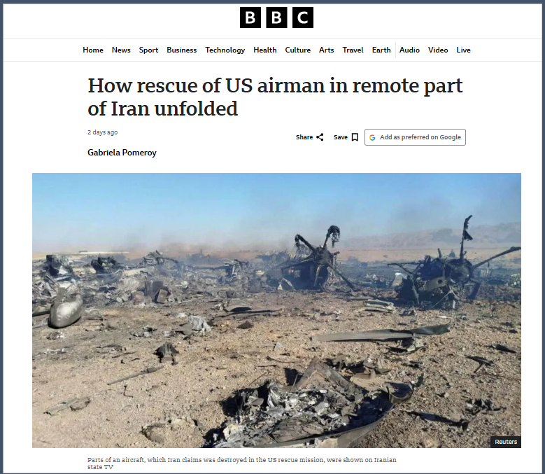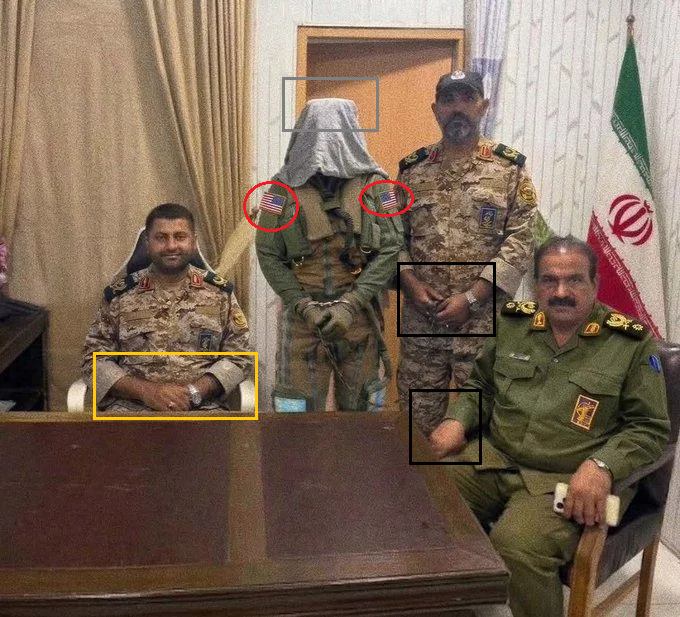මෙහි එක් ඡායාරූපයක අදාළ අමෙරිකානු සොල්දාදුවා අල්ලාගෙන ඇති බවත් ඔහු ඉරාන ආරක්ෂක අංශ භාරයේ සිටින බවටත් හැඟී යන අතර තවත් ඡායාරූපයේ කිහිපදෙනෙකු විසින් අමෙරිකානු ධජය සහිත කලිසමක් අතින් අල්ලා ගෙන සිටින අයුරු පෙන්නුම් කරන අතර එම ඡායාරූපය පළ කර ඇත්තේ, ඉරාන විප්ලවවාදී ආරක්ෂක බලකාය බිම හෙළූ F-15E යානයේ සිටි සාමාජිකයෙකුගේ යට ඇඳුමක් සොයාගත් බව පවසමිනි. මේ අතර මෙම සටහනේ ඇති අවසන් ඡායාරූපයේ දැක්වෙන්නේ, තවත් ඉරානය හෙළිකොප්ටර් යානා දෙකක් විනාශ කර ඇති බවයි.