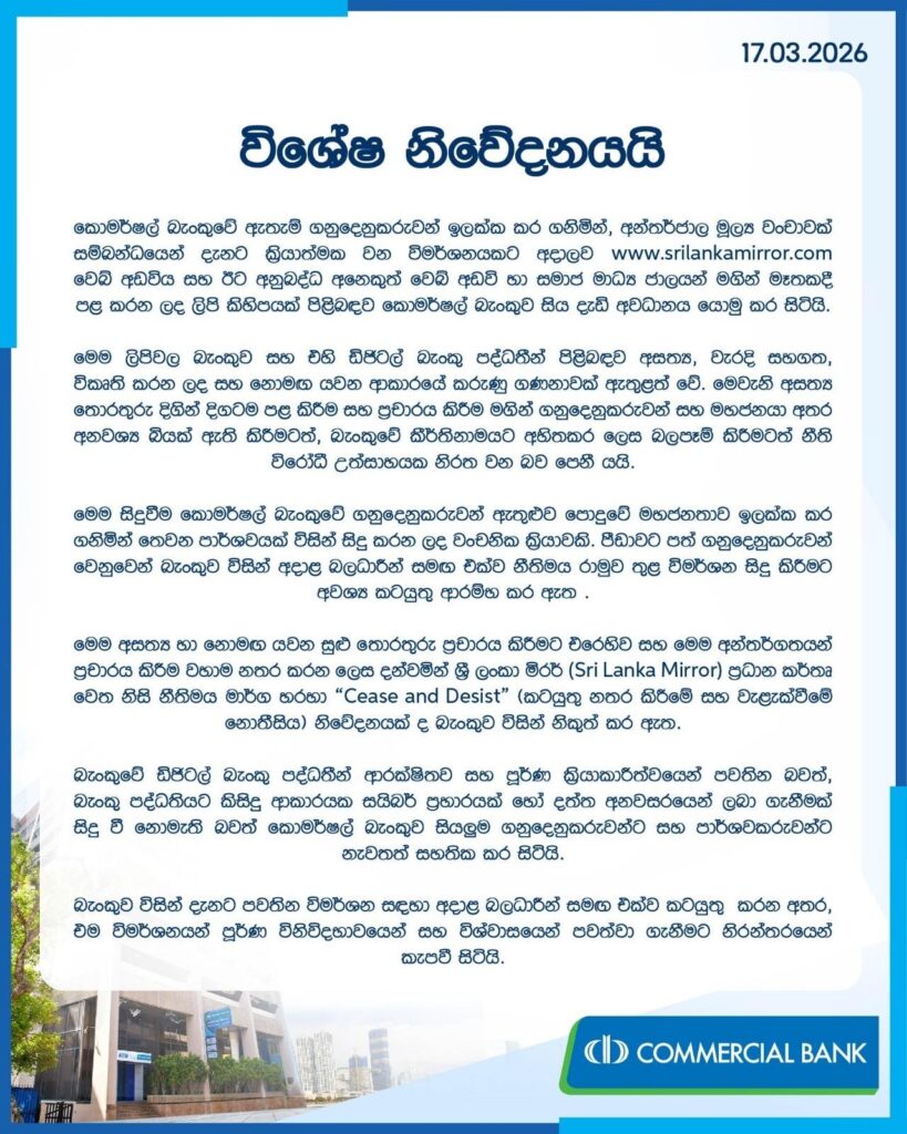 “කොමර්ෂල් බැංකුව හරහා වූ තවත් හොරකමක් ගැන CID විමර්ශනයක්!” යනුවෙන් සටහනක් පළ වී තිබුණා.