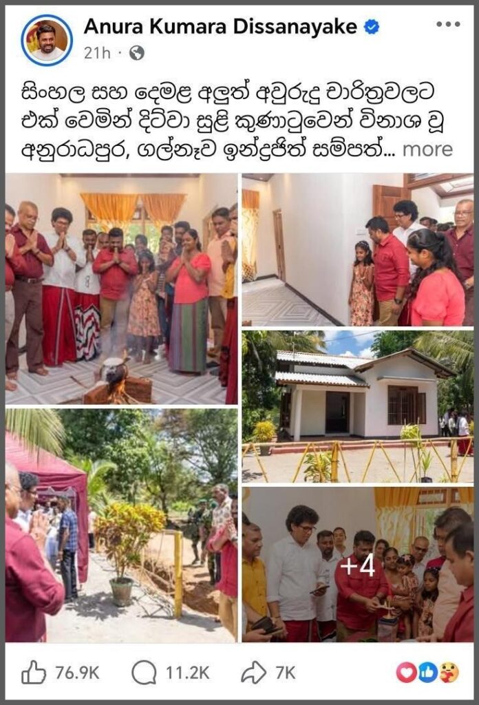 ඒ යටතේ ඉදි කළ, නව නිවෙසක පැවැත්වුණු අලුත් අවුරුදු සැමරුමක් සඳහා අප්රේල් 14 වන දින ජනාධිපති අනුර කුමාර දිසානායක මහතා සම්බන්ධ වූ බව දක්වමින් ජනාධිපති අනුර කුමාර දිසානායක මහතාගේ නිල ෆේස්බුක් පිටුව ඔස්සේ සටහනක් පළ කර තිබුණේ මෙලෙසින්.