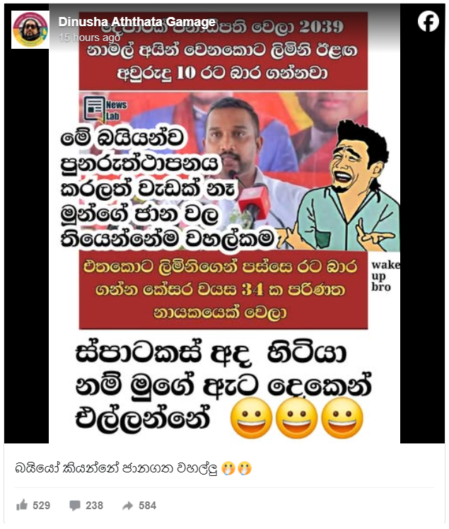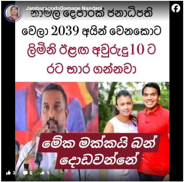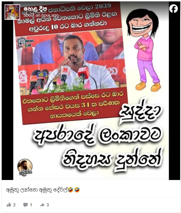 “දෙපාරක් ජනාධිපති වෙලා 2039 නාමල් අයින් වෙනකොට ලිමිනි ඊළග අවුරුදු 10 රට බාර ගන්නවා. එතකොට ලිමිනිගෙන් පස්සෙ රට බාර ගන්න කේසර වයස 34ක පරිණත නායකයෙක් වෙලා” යනුවෙන් පොදුජන පෙරමුණේ සාමාජිකයෙක් සිදු කළ ප්රකාශයක් ලෙසට දක්වමින් සටහනක් හුවමාරු වී තිබුණා.