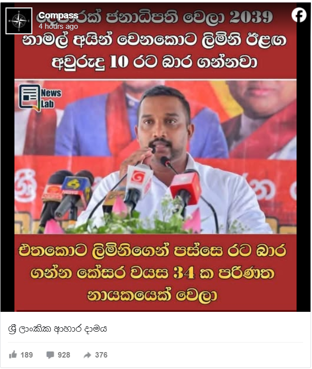 ඉහත සමාජ මාධ්ය සටහන් වල දැක්වෙන ලෙස News Lab ෆේස්බුක් පිටුවේ, මෙවැනි සටහනක් පළ වී ඇත් ද, යන්න පරීක්ෂා කිරීමට අප පියවර ගනු ලැබුවා. නමුත් ඉහත දැක්වෙන ලෙස 2029 සිට නාමල් රාජපක්ෂ දෙවරක් ජනපති වන බව ද, නාමල්ගේ බිරිඳ වන ලිමිනි ඊළග අවුරුදු 10 ද , ලිමිනි සහ නාමල්ගේ පුතු වන කේසර, ඉන් අනතුරුව රට බාරගන්නා පරිණත නායකයෙක් වනු ඇතැයි යනුවෙන් ප්රකාශයක් එහි සඳහන් නොවේ.