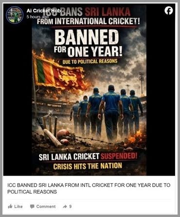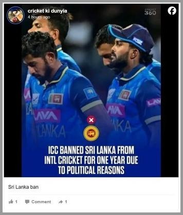 “දේශපාලන හේතූන් මත ICC විසින් ශ්රී ලංකාවට වසරක ජාත්යන්තර ක්රිකට් තහනමක් පනවා ඇති බවට පළ වූ සමාජ මාධ්ය සටහනක් පහතින්.