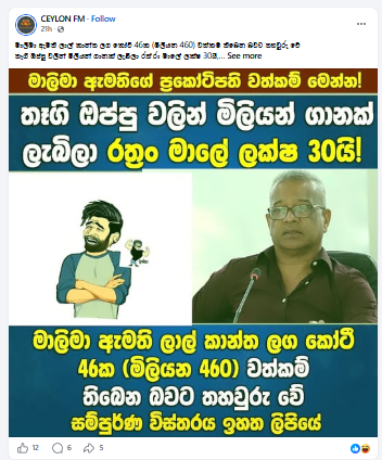 “ඇමති ලාල්ට කෝටි 46කට එහා වත්කම්යනුවෙන් සඳහන් කරමින් හිරු News හි පුවතක් පළ වී තිබුණා. අමාත්‍ය ලාල් කාන්ත විසින් ඉදිරිපත් කළ  වත්කම් බැරකම් ප්‍රකාශයට අනුව මෙම වත්කම් ප්‍රමාණය අඩංගු බව එහි සඳහන් කර තිබුණේ මෙලෙසින්.