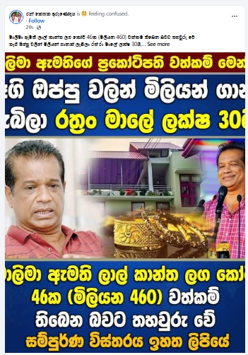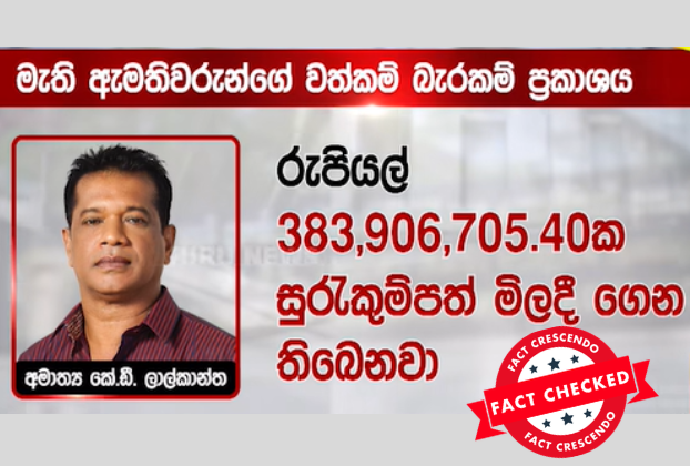 Conclusion (අවසාන නිගමනය) :අපගේ විමර්ශනයෙන් පෙන්වා දෙන්නේ, සමාජ මාධ්‍ය ඔස්සේ මෙන් ම ප්‍රධාන මාධ්‍ය ධාරා විසින් වාර්තා කර තිබූ අමාත්‍ය ලාල් කාන්ත මහතාගේ වත්කම් බැර ප්‍රකාශයේ මිලදී ගෙන ඇති සුරැකුම්පත් ප්‍රමාණය රු. 383,906,705.40 ක් ලෙස දක්වා තිබීම නොමග යන සුළු බවයි. වත්කම් බැර ප්‍රකාශයට අනුහ අමාත්‍යවරයා සතු සුරැකුම්පත් වල වටිනාකම වූයේ රු.143,476කි.( රුපියල් එක්ලක්ෂ හතළිස් තුන් දහස් හාරසිය හැත්ත හයක් වේ) නමුත් සුරැකුම්පත් ආයෝජන කළ ආයතන 10ක ‌ ආයෝජන කර තිබූ කොටස් ප්‍රමාණය, ඒකක මිල ලෙස ගෙන එහි වටිනාකමින් වැඩි කර මෙය නොමග යන ලෙස ඉහත ප්‍රධාන මාධ්‍ය ධාරා විසින් මෙන් ම සමාජ මාධ්‍ය ලෙස සුරැකුම්පත් වල මුළු වටිනාකම ලෙස වාර්තා කර ඇත. එක්ලක්ෂ හතළිස් තුන් දහස් හාරසිය හැත්ත හයක සුරැකුම් පත් වල සත්‍ය වටිනාකම වෙනුවට වැරදියට ගණනය කිරීම හේතුවෙන් කෝටි 38ක සුරැකුම්පත් වටිනාකමක් ඇති බවට ඉහත ප්‍රධාන මාධ්‍ය වාර්තා පෙන්වා දීම තුළින්, අමාත්‍යවරයාගේ සියලු වත්කම් කෝටි 46 ඉක්මවන බවට පැවසීම නොමග යන සුළු වේ.