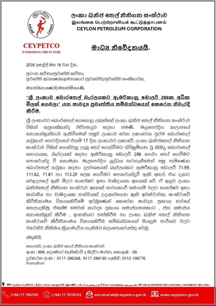 පළ වී ඇති මාධ්ය වාර්තා සම්බන්ධයෙන් නිවේදනයක් නිකුත් කරමින් ලංකා ඛනිජ තෙල් නීතිගත සංස්ථාව ප්රකාශ කරන්නේ, සංස්ථාව ශ්රී ලංකාවට බොරතෙල් ආනයනය කරන්නේ, සපුගස්කන්ද පිරිපහදුව සඳහා පමණක් බවයි. ඒ අනුව සංස්ථාව ගෙන්වනු ලැබූ හෝ ගෙන්වීමට ගිවිසුම්ගත වූ කිසිදු බොරතෙල් තොගයක, බැරලයක් සඳහා ඇමරිකානු ඩොලර් 286 ගෙවා හෝ ගෙවීමට පොරොන්දු වී නොමැති බව සංස්ථාව අදාළ නිවේදනය මගින් අවධාරණය කරයි.