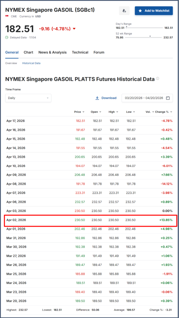 අප්රේල් 02 වැනිදා රජය ඩොලර් 286කට මිලදී ගත්තේ ඩීසල් බවට සඳහන් කර තිබූ බැවින් අප ලෝක වෙළඳ පොළේ, එම දිනයන් හි ඩීසල් බැරලයක මිල ගණන් කොමපමණ ද, යන්න පරීක්ෂා කරනු ලැබුවා. එහිදී සිංගප්පූරුවේදී, ඩීසල් බැරලයක මිල අමෙරිකානු ඩොලර් 230 ගණන් වල සනිටුහන් වී ඇති බව දැක ගන්නට ලැබුණා.