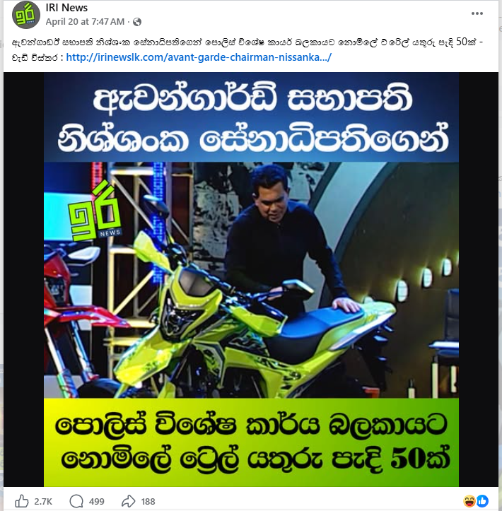 ඇවන්ගාඩ් සභාපති නිශ්ශංක සේනාධිපතිගෙන් පොලිස් විශේෂ කාර්ය බලකායට නොමිලේ ට්රෙිල් යතුරු පැදි 50ක් යන තේමාවෙන් IRI News මෙම සටහන පළ කර ඇත්තේ වැඩි විස්තර සඳහා වන සබැඳියක් ද සහිතවයි. සටහන සමගින් පළ කරන ලද සබැඳියේ දැක්වෙන්නේ, මේ පිළිබඳව ඇවන්ගාඩ් සභාපතිවරයා සිරස TV ඔස්සේ විකාශය වූ ඔටෝවිෂන් වැඩසටහනේදී අනාවරණය සිදුකර ඇති බවයි. irinewslk|Archived Link