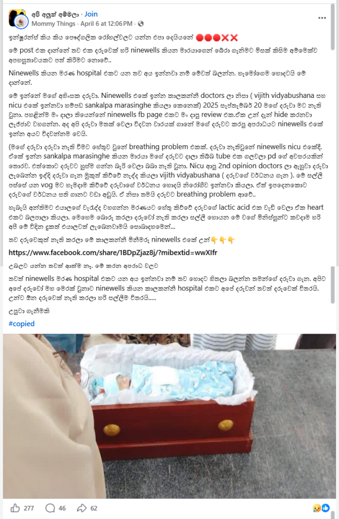ඒ මහතා සඳහන් කළේ මෙම දරුවා උපත ලැබුවේ, 2025 වසරේ සැප්තැම්බර් 09 වන දා බව ත්, මෙම දරුවා ඉපදීමෙන් පසුව දරුවාගේ Lactate මට්ටම ඉහළ යෑම මත පරිවෘත්තීය ආබාධ ඇති වූ අතර මේ පිළිබදව පරීක්ෂා කිරීම සඳහා සැප්තැම්බර් 12 දරුවාගේ රුධිර සාම්පල ඉන්දියාවේ රසායානාගාර පරීක්ෂාවකට යොමු කළ අතර අදාළ පරීක්ෂණ වාර්තා පැමිණීමට පෙර දරුවා සැප්තැම්බර් 20 වන දා ජීවිතක්ෂයට පත් වූ බවයි.