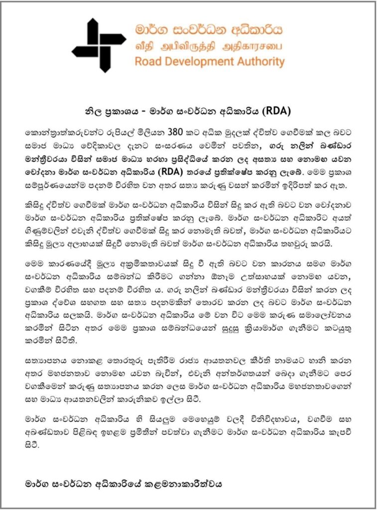 එමෙන් ම මේ පිළිබඳව තවදුරටත් තහවුරු කරමින්, මාර්ග සංවර්ධන අධිකාරිය විසින් මාධ්ය වෙත නිවේදනයක් යොමු කර තිබුණා.
