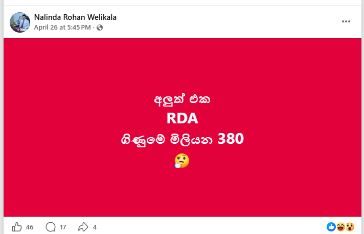 මාර්ග සංවර්ධන අධිකාරිය විසින් එහි මූලික ගිණුමෙන් මිලියන 380ක් කලින් අවස්ථාවක මුදල් ගෙවා ඇති කොන්ත්රාත්කරුවන්ට වැරදීමකින් නැවත ගෙවීම් කර ඇති බවට දක්වමින් සමගි ජන බලවේගයේ පාර්ලිමේන්තු මන්ත්රී නලීන් බණ්ඩාර විසින් සිදු කළ ප්රකාශයක් සමාජ මාධ්ය ඔස්සේ සංසරණය වී තිබුණා.