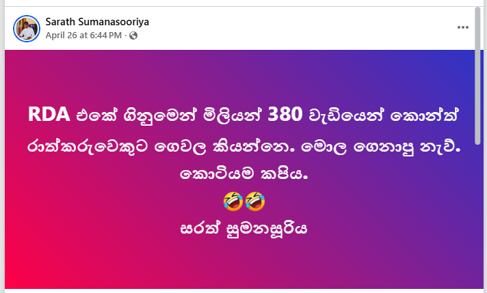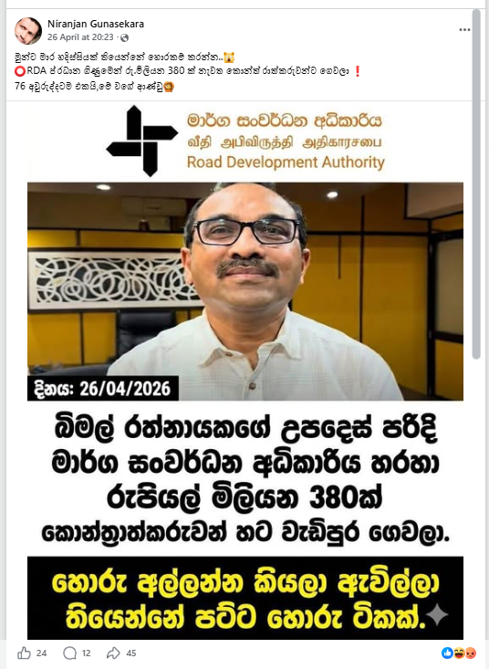 මේ ඔස්සේ මාර්ග සංවර්ධන අධිකාරිය හරහා රුපියල් මිලියන 380ක් කොන්ත්රාත්කරුවන් හට වැඩිපුර ගෙවා ඇති බවට දක්වමින් සමාජ මාධ්ය සටහන් හුවමාරු වුණා.