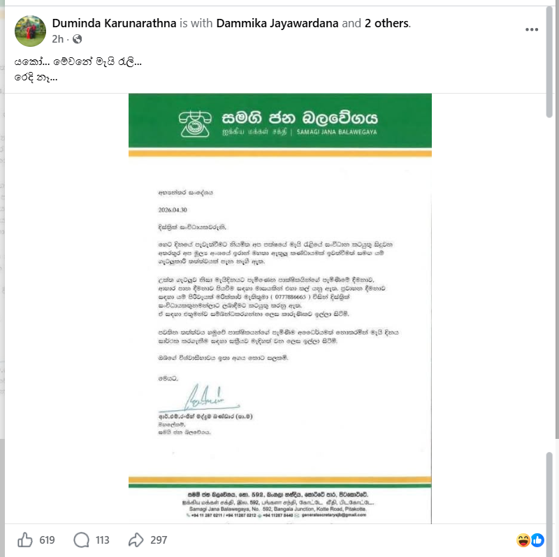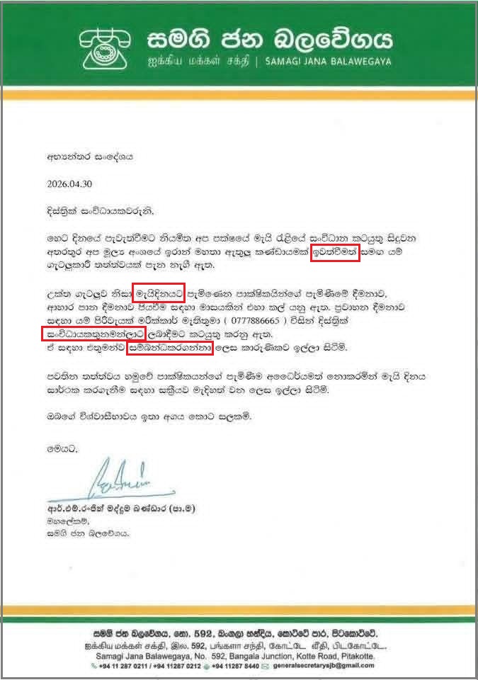 එමෙන් ම සමගි ජන බලවේගයේ මාධ්ය අංශය ද, තහවුරු කරන්නේ, මෙම ලිපියේ සඳහන් කරුණු අසත්ය බව ත්, මෙවැනි ලිපියක් දිස්ත්රික් ලේකම්වරුන්ට පක්ෂයේ මහලේකම්වරයා විසින් යොමු නොකර ඇති බවයි. සමගි ජන බලවේගයේ මැයි රැලිය කඩාකප්පල් කිරීමේ අරමුණින්, මෙවැනි අසත්ය සටහන් හුවමාරු කර ගන්නා බව ත්, ඔවුන් වැඩි දුරටත් පෙන්වා දුන්නා.