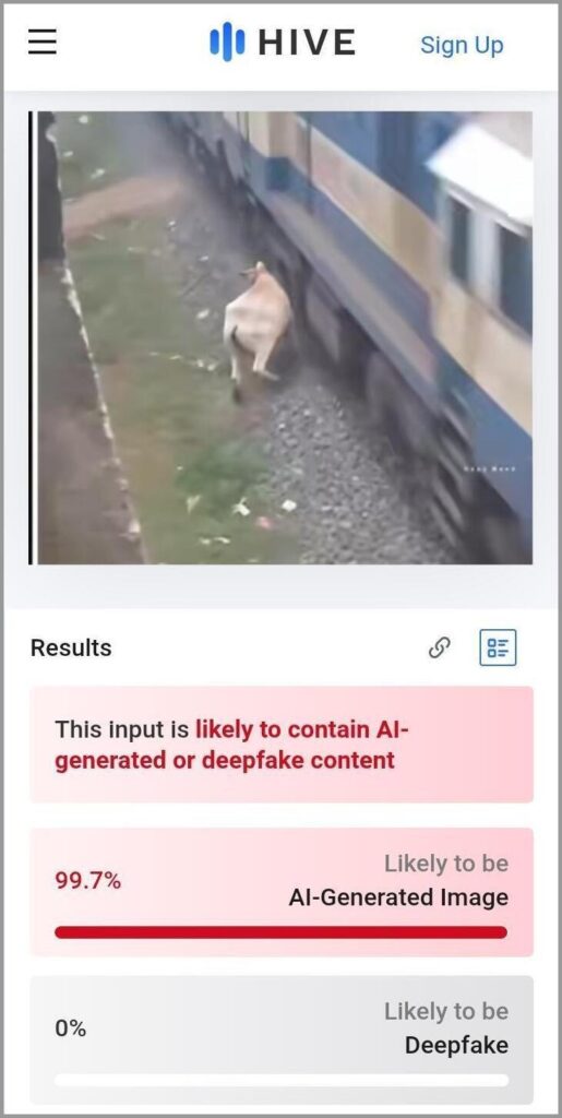 Our investigation found that the viral video showing a cow near a small child by a railway track as an express train passes was created using artificial intelligence, rather than recorded in real life. Several elements in the clip appear inconsistent with real-world conditions, and an AI-content detection tool indicated a high likelihood that the footage is synthetically generated. Based on these findings, the claim is false and the video should be treated as AI-generated content rather than a real incident.