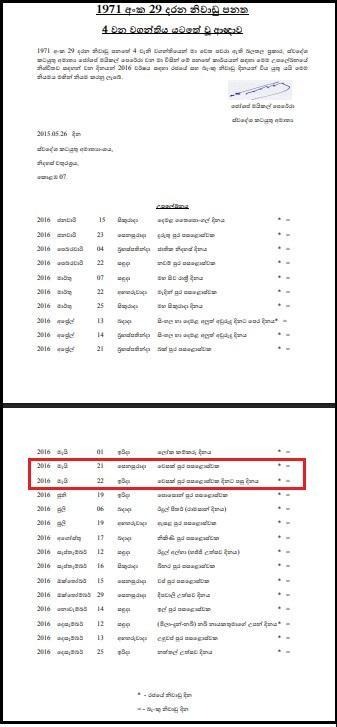 A subsequent review was conducted to identify prior instances of Sundays being declared public holidays. This investigation confirmed that in 2016, Vesak Poya Day fell on a Saturday, and the following Sunday was declared a public holiday accordingly.