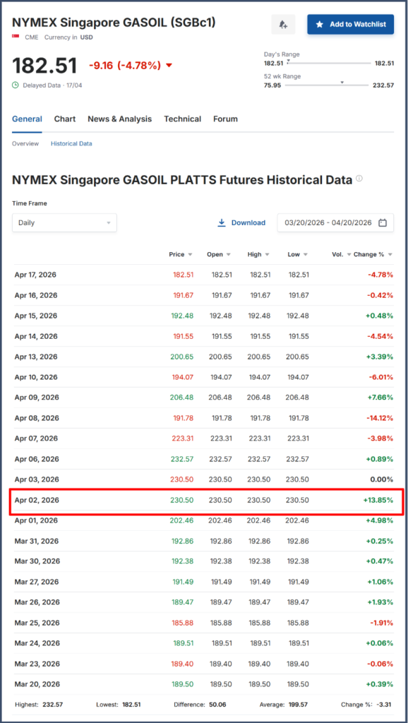 Since it was stated that the government purchased diesel for $286 on April 2nd, we checked the price of a barrel of diesel on the world market on those dates. There, we saw that the price of a barrel of diesel in Singapore was around $230.