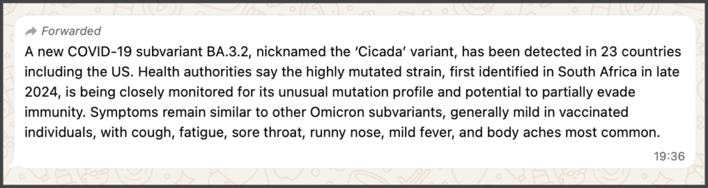 Multiple social media users shared a warning about a new COVID-19 variant, stating that the BA.3.2 subvariant, nicknamed the “Cicada” variant, has been detected in 23 countries, including the United States. The message says health authorities are closely monitoring the highly mutated strain, first identified in South Africa in late 2024, due to its unusual mutation profile and potential to partially evade immunity. It adds that symptoms remain similar to other Omicron subvariants and are generally mild in vaccinated individuals, with cough, fatigue, sore throat, runny nose, mild fever, and body aches most common.