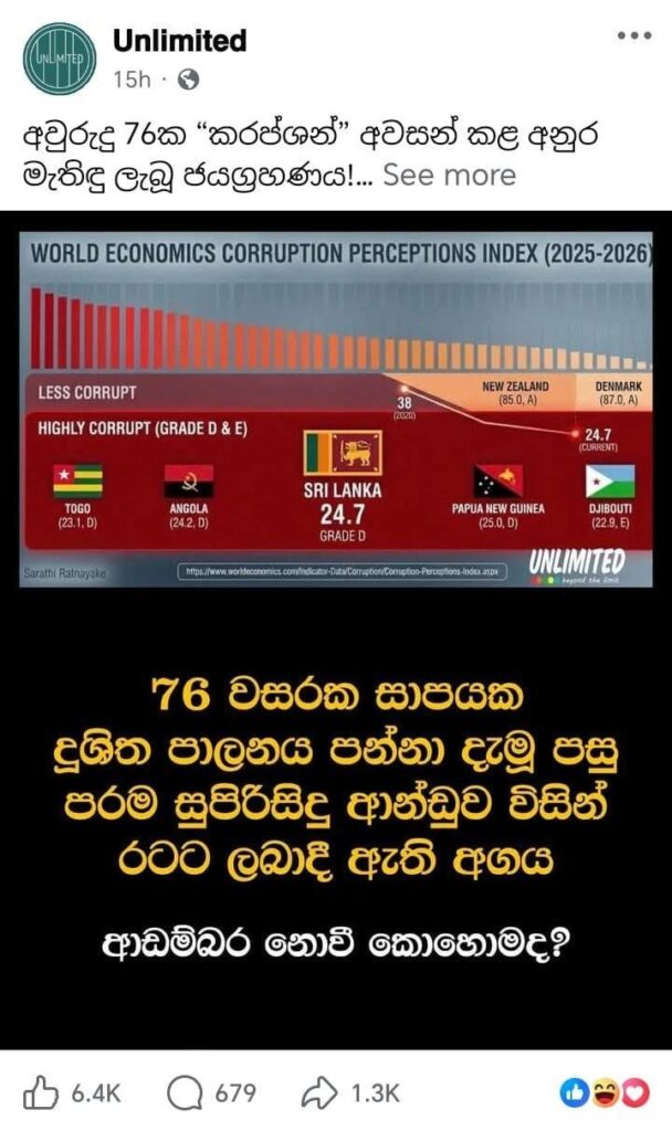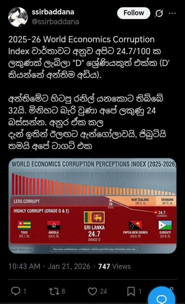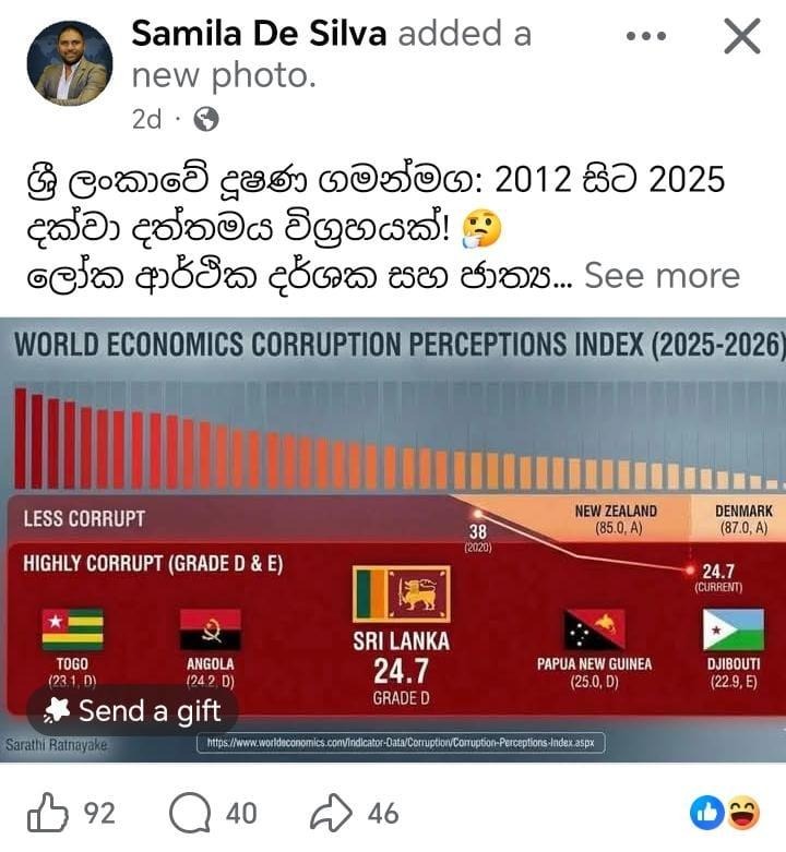A social media post stated, “According to the latest report of the 2025 World Economic Corruption Index, we have a score of 24.7/100 (not Distinction, ‘D’ is the lowest rank.) (The value of 32/100% in 2024 has dropped to 24.7% this year). During the Rajapaksa era, which is said to be extremely corrupt, Sri Lanka was ranked 87th among the least corrupt countries in the world, and is currently ranked 121st.”