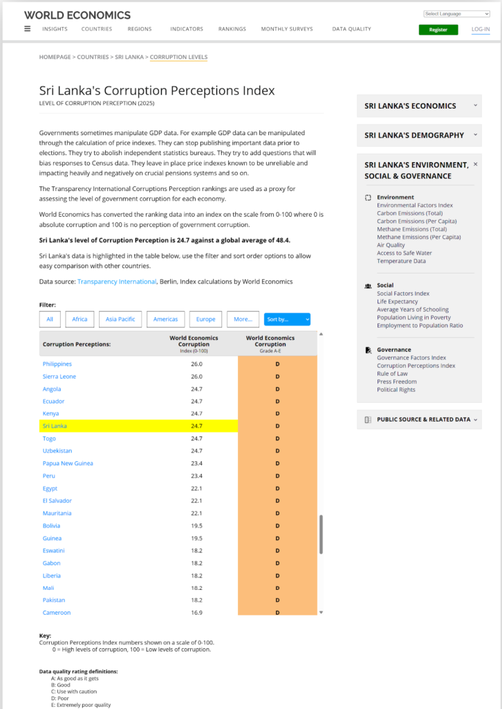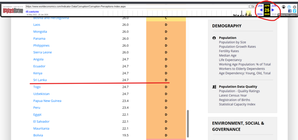Our investigation shows that Sri Lanka’s corruption score of 24.7 is not taken from a recent report published by World Economics for the year 2025, but from an index created based on data from the CPI report published by Transparency International for the year 2024. That report has been published in the first half of 2025.