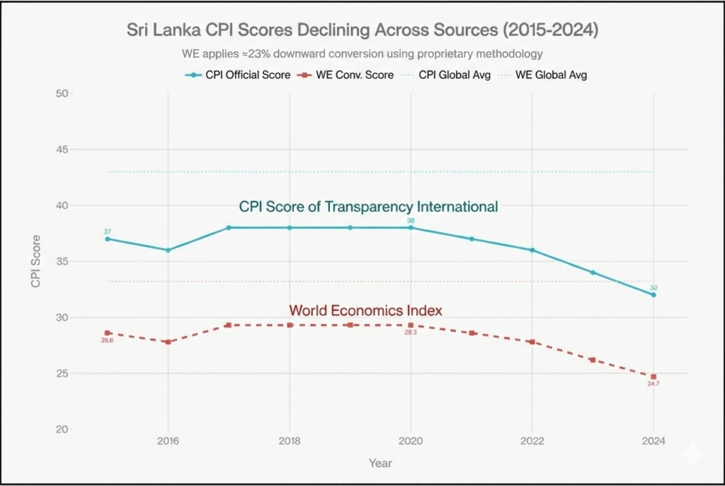Below is how Sri Lanka’s scores have changed over the past few years in World Economics and Transparency International.