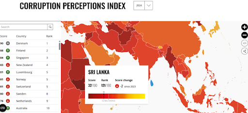 Accordingly, the latest published Corruption Perceptions Index values for 2024 show that Sri Lanka’s score has decreased by two indicators, from 34 to 32, compared to 2023.