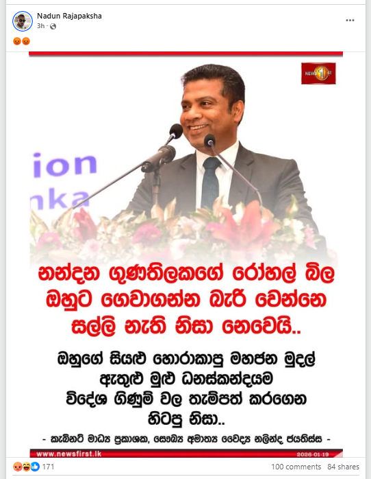 Our investigation shows that the fake news being circulated on social media using the News1st format, claiming that Minister Nalinda Jayatissa made a statement stating that after the death of prominent politician Nandana Gunasena, he was unable to pay the hospital bill he received treatment for, not because he lacked funds, but because his money was deposited in foreign accounts, is a false news editorial, and that the Minister has not made such a statement.
