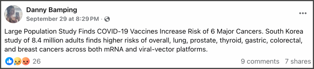 Overall, this claim misrepresents the study’s findings. The evidence shows correlation, not causation. The South Korean study published in September 2025 found statistical associations between COVID-19 vaccination and increased risks for certain specific cancers within one year, but it does not prove that vaccines cause cancer.