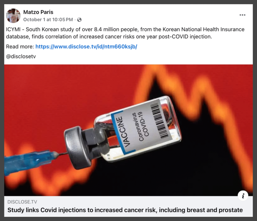 Multiple social media users recently shared the claim that a South Korean study found that COVID-19 vaccines caused cancer.