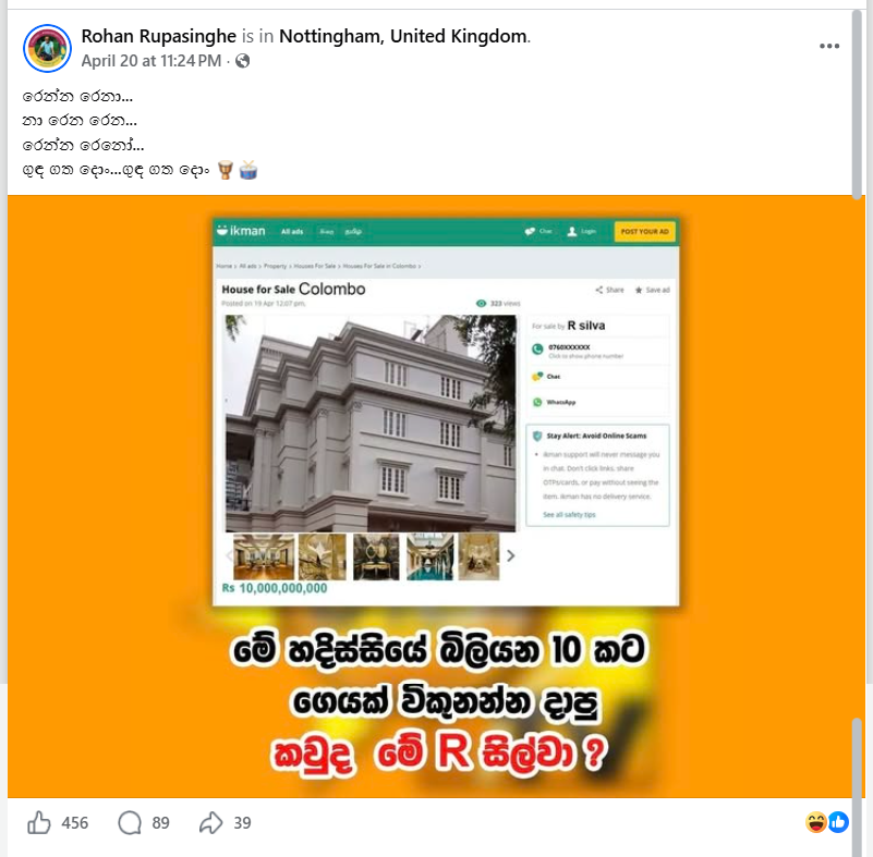 A post circulating on social media poses the question: “Who is this R. Silva who suddenly put a house worth Rs. 10 billion up for sale?” The post was accompanied by an image purportedly showing a property listing on ikman.lk.