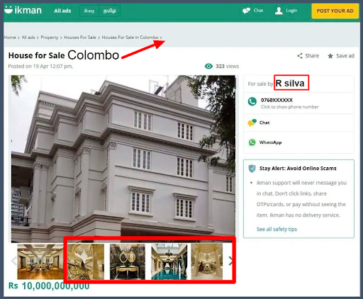 The viral image uses these photographs, posted as a property listing on ikman.lk, with the contact’s name listed as “R. Silva” and the price set at Rs. 10 billion.