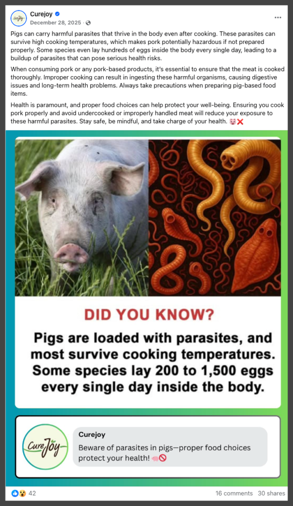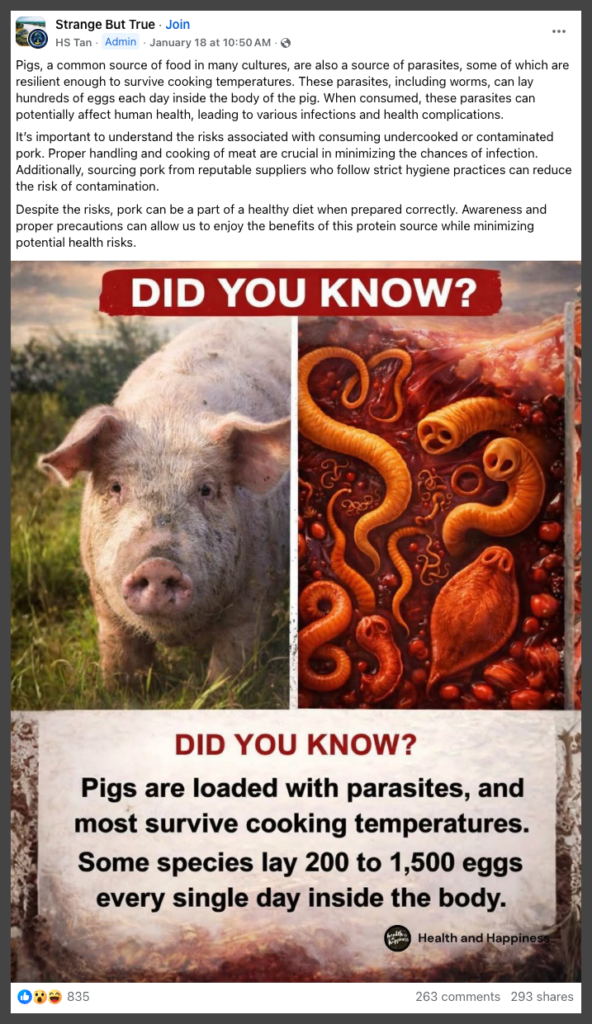 Viral posts typically assert that pork contains parasites that “survive high cooking temperatures,” remain alive inside the body even after meals are cooked, and rapidly multiply by laying hundreds of eggs per day.