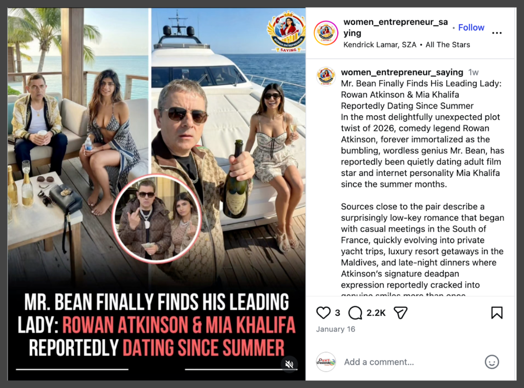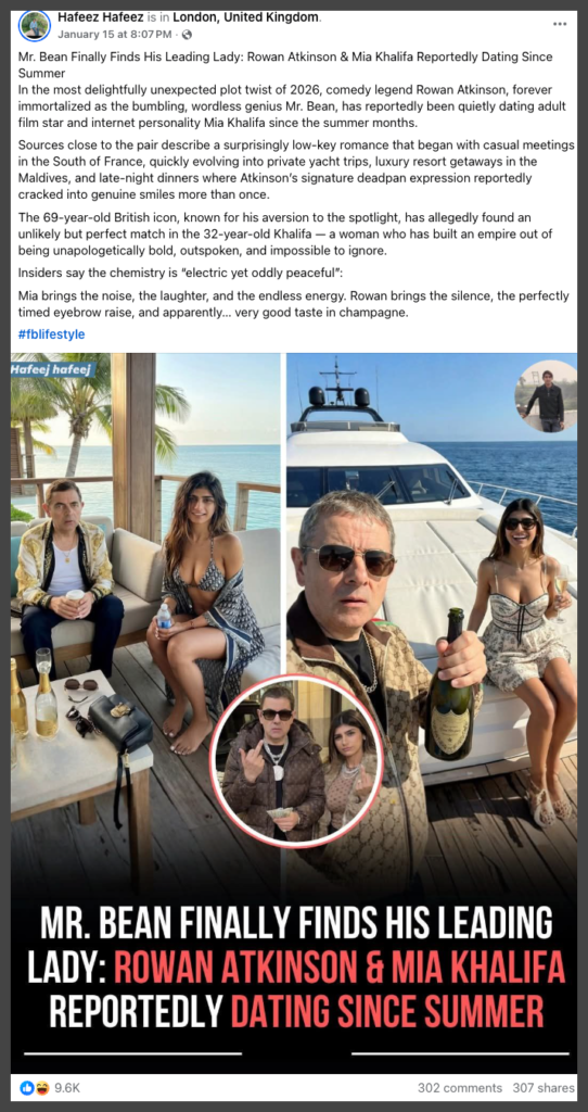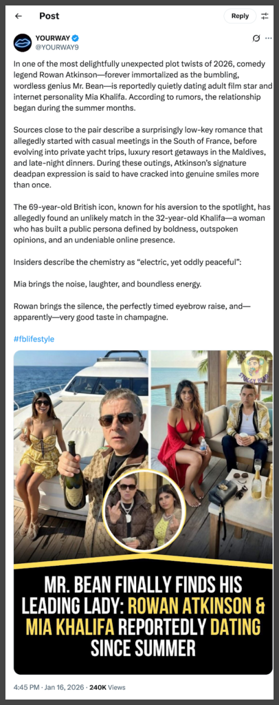 Multiple users, including entertainment pages on Facebook, Instagram, and X, have shared images claiming that Rowan Atkinson and Mia Khalifa are reportedly dating. These posts have garnered significant attention across all platforms.