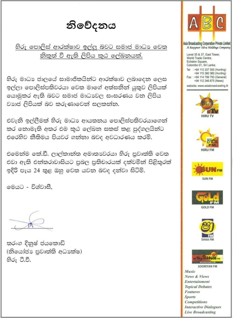 This letter claims to have been sent on the 19th by the Deputy News Director of Hiru TV, Tharanga Jayakodi. It further states the following: