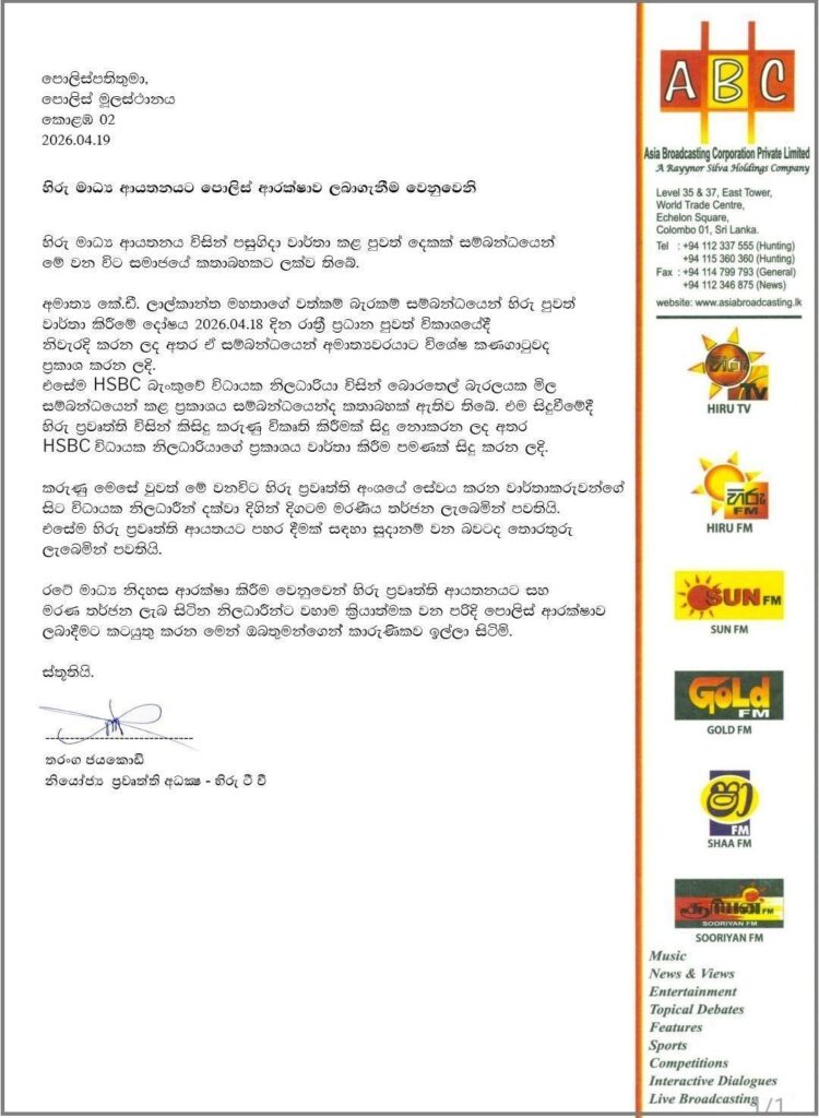During inquiries made with senior management, it was clarified that neither Hiru TV nor its media network has requested police protection for the institution or its employees from the Inspector General of Police, either in written or verbal form. It was further revealed that the official letterhead of “ABC Media Network” has been misused and the document circulating on social media is a fabricated letter designed to resemble an official communication. In addition, a signed statement confirming the inaccuracy of this letter was provided to us by the Deputy News Director of Hiru TV, Tharanga Jayakodi.