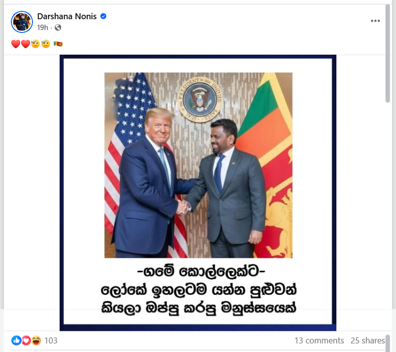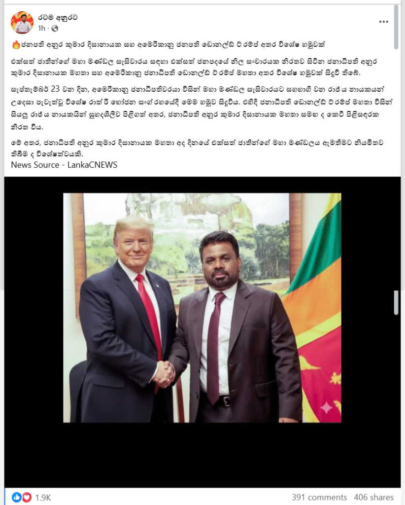 A purported photo of President Anura Kumara Dissanayake and US President Donald Trump was published on social media, stating that a special meeting had taken place between the two leaders.