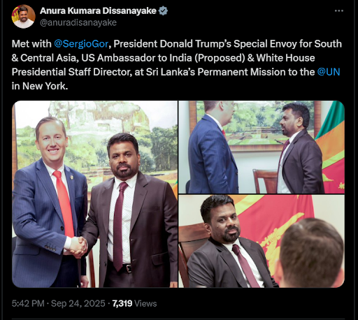 Commenting on the above occasion, the Presidential Media Division explained that a special meeting took place between President Anura Kumara Dissanayake and the President’s Special Representative for South and Central Asia, the United States Ambassador designated to India, and White House Chief of Staff, Sergio Gor. It had taken place on the 23rd at the Permanent Mission of Sri Lanka to the United Nations. Facebook