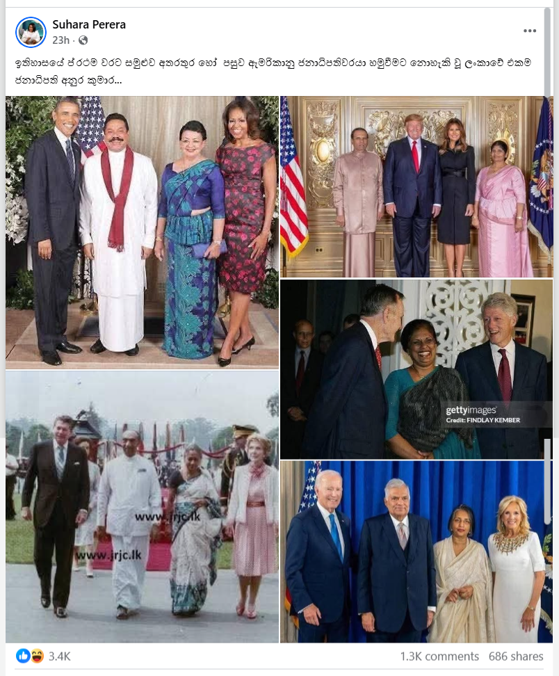 A collection of photos showing former Sri Lankan presidents with former US presidents claimed that for the first time in history, Anura Kumara had become the only Sri Lankan President who was unable to meet a US president during or after a world leaders’ summit, as seen below.