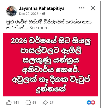 To verify the facts in this regard, we inquired with Ms. S. Vijitha Basnayake, the Media Secretary to the Minister of Education, Prime Minister Harini Amarasuriya. She stated that this is false news and that no such decision has been made yet.