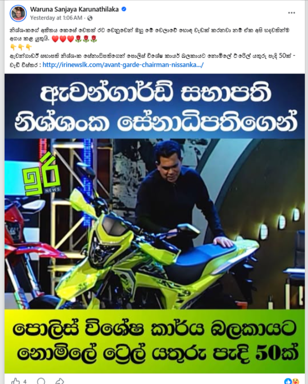 IRI News has published an article titled “50 free trail bikes for the Police Special Task Force from Avant Garde Chairman Nissanka Senadhipathi” and included a link for more information. The link published with the article states that the Avant Garde Chairman revealed this in the Auto Vision program broadcast on Sirasa TV. irinewslk | Archived Link