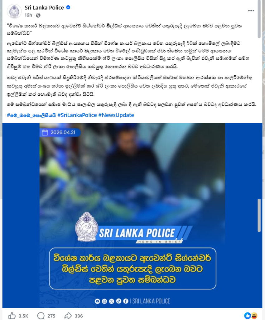 Furthermore, when making such a donation, a request must be made through the Ministry of Public Security and Parliamentary Affairs, following a proper procurement process, and submitted to the Sri Lanka Police. The police also stated in the post that no such request has been made so far.
