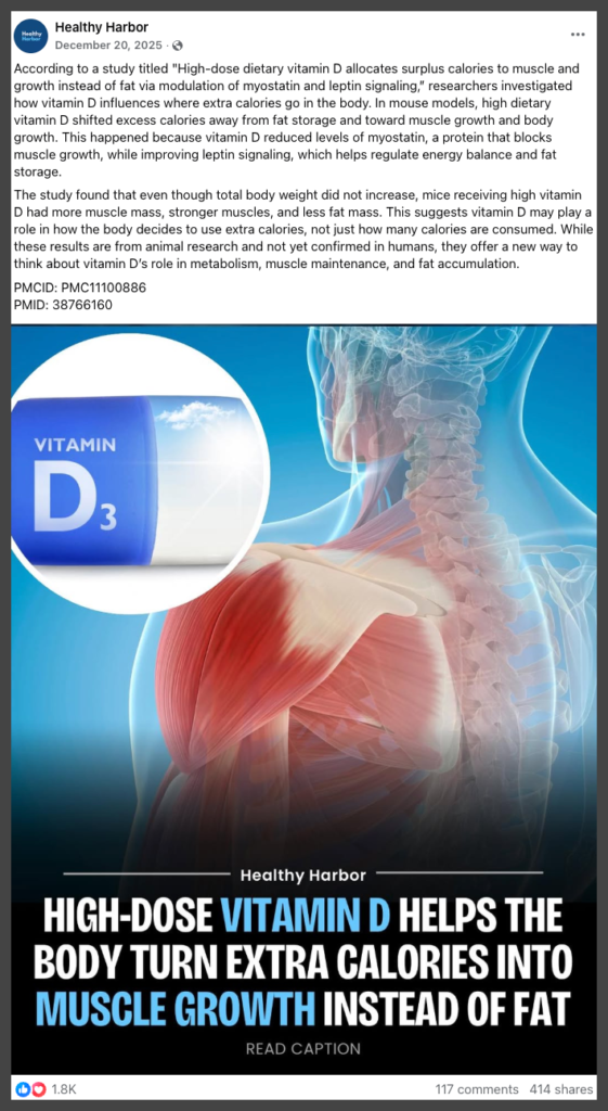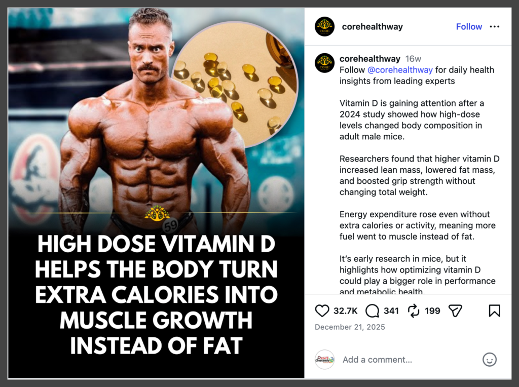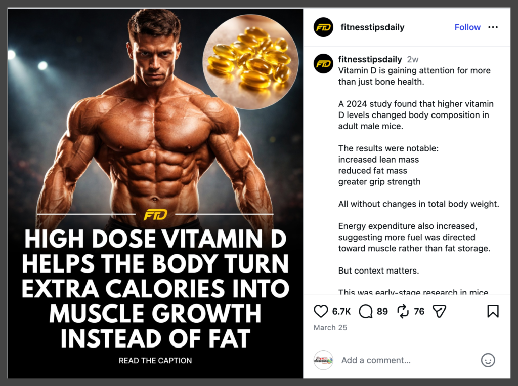 Posts shared widely online claim that “high-dose vitamin D redirects calories toward muscle growth instead of fat storage,” and the claim is gaining traction on both Facebook and Instagram.