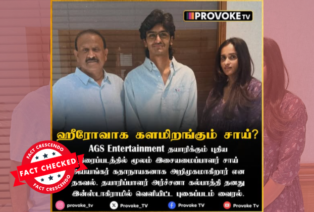 நாம் மேற்கொண்ட ஆய்வின் அடிப்படையில் AGS தயாரிக்கும் புதிய திரைப்படத்தில் இசையமைப்பாளர் சாய் அப்யங்கர் கதாநாயகனாக அறிமுகமாகிறார் என பரவும் செய்தி தவறானவை என கண்டறியப்பட்டது.