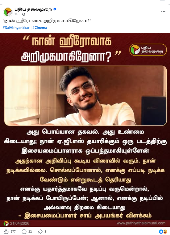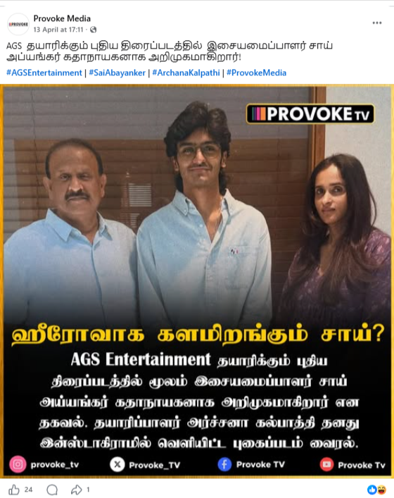 நாம் முதலில் AGS Entertainment நிறுவனத்தின் உத்தியோகப்பூர்வ சமூகவலைத்தளங்களில் இது தொடர்பாக ஆய்வினை மேற்கொண்டபோது, சாய் அப்யங்கர் கதாநாயகனாக நடிக்க இருப்பதான அறிவிப்புக்கள் எதுவும் பதிவிட்டிருக்கவில்லை.