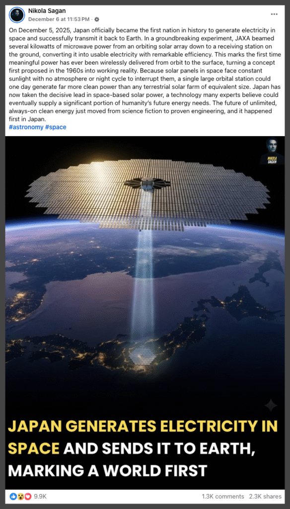 The viral posts assert that Japan has officially become the first nation in history to generate electricity in space and successfully transmit it back to Earth. The claim was widely spread on multiple platforms.
