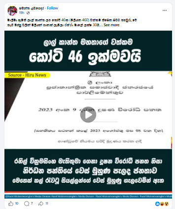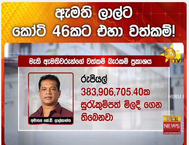 Hiru News broadcast a news report with the headline, “Minister Lal owns assets exceeding 46 crore.” The report stated that this asset value was based on the statement of assets and liabilities submitted by Minister Lal Kantha, and it was presented as follows.