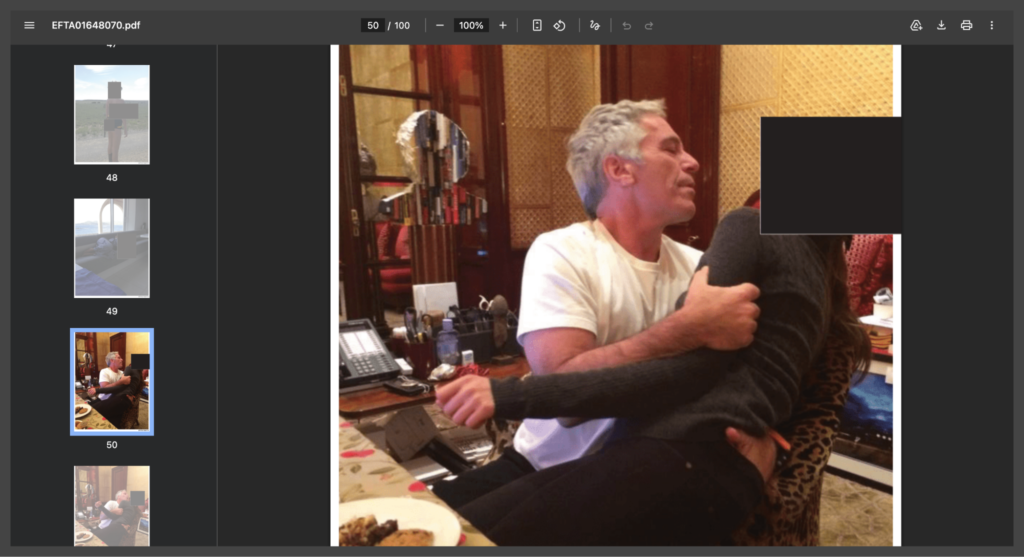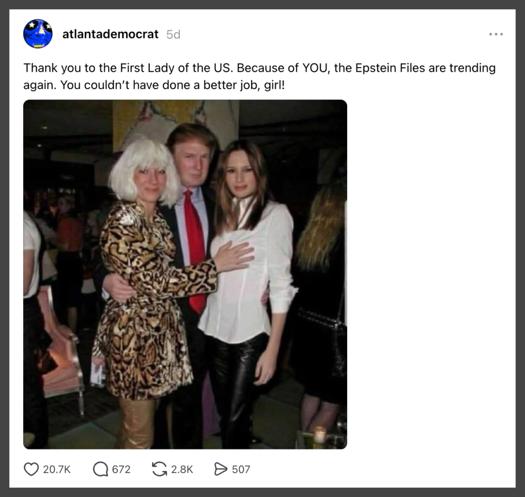 Further analysis indicates that the viral photo has been digitally altered, with Melania Trump’s face inserted into another image. Available comparisons indicate the source image comes from Epstein-related archives and does not include Melania Trump.