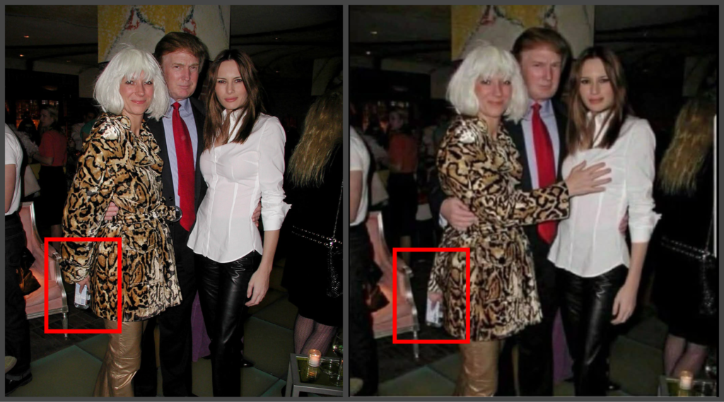 Digital analysis reveals clear signs of manipulation. In the altered version, Maxwell’s hand appears duplicated and repositioned onto Melania Trump’s chest, while the original hand placement behind her back remains faintly visible.