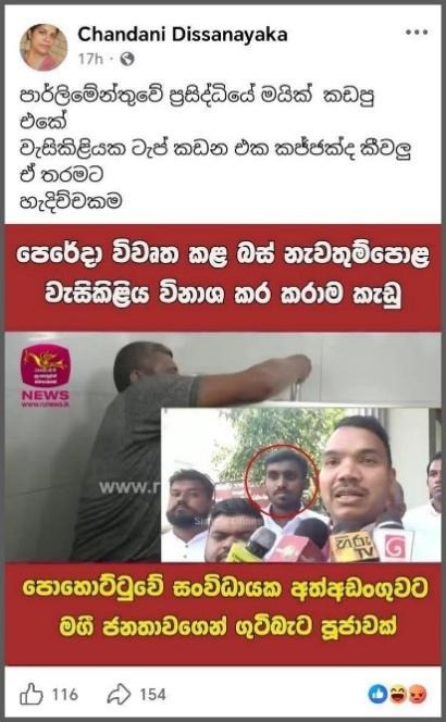 It is noteworthy that it was in this context that a post was shared on social media showing a person appearing in a photo with Member of Parliament Namal Rajapaksa, claiming that an organizer of the Pohottuwa group that destroyed the toilet and broke the faucet at the Pettah bus stand had been arrested.