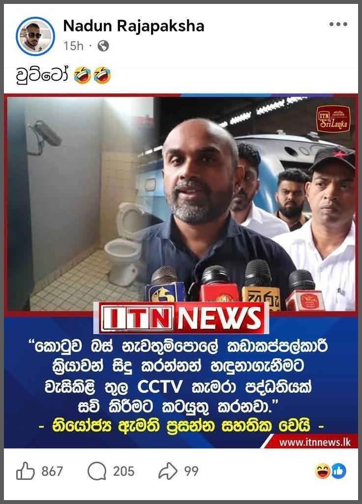 An ITN News-style post was circulating on social media stating, “Work is underway to install a CCTV camera system in the toilets to identify those who commit acts of sabotage at the Kotuwa bus stand – Deputy Minister Prasanna assures.”
